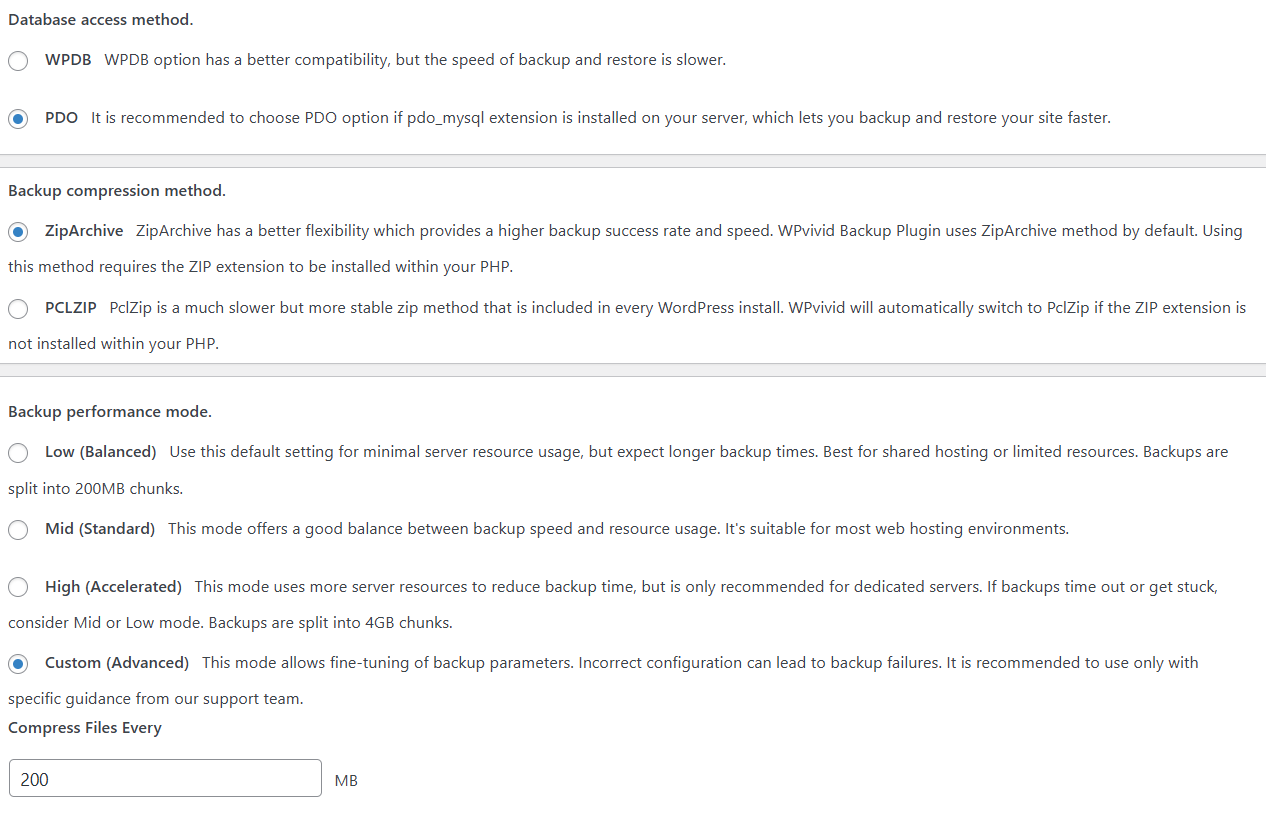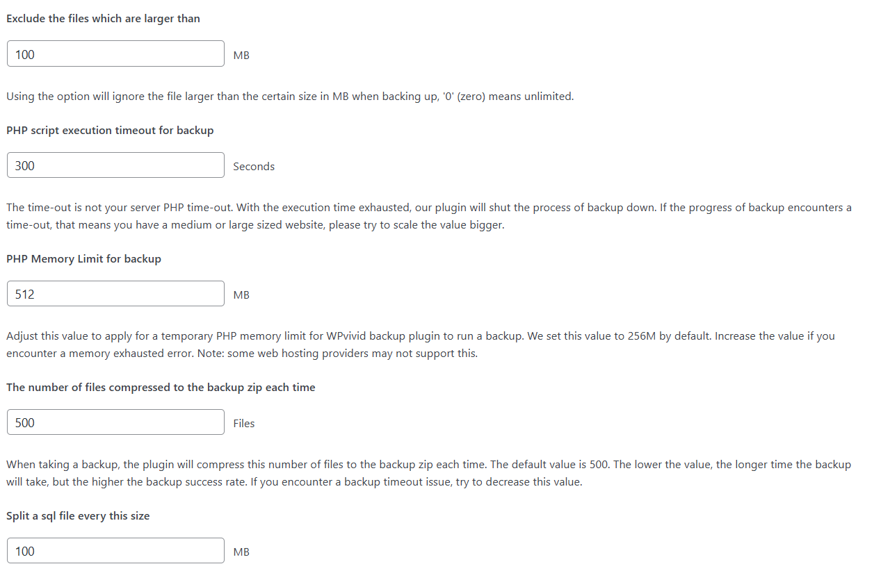 Backup timeouts and unresponsive tasks are usually a result of insufficient server resources. However, you can adjust the following WPvivid settings to optimize the backup process and improve the backup success rate: