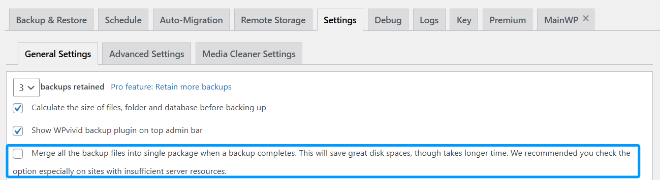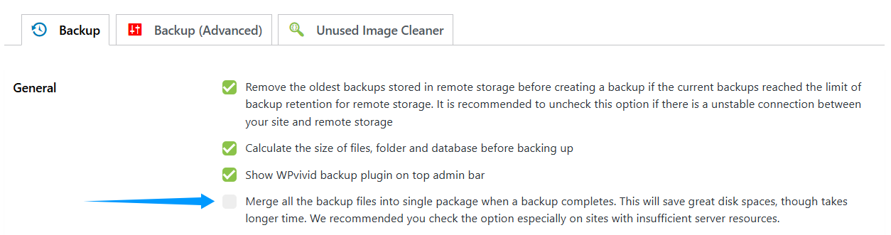 • 1. Untick ‘Merge all the backup files into single package when a backup completes’