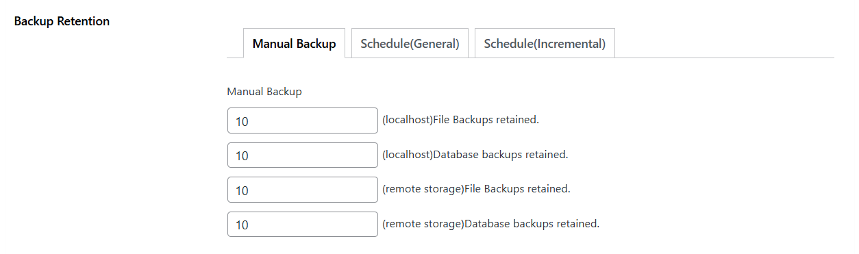– Schedule (Incremental) Backups: How many backups to retain from your incremental schedule.