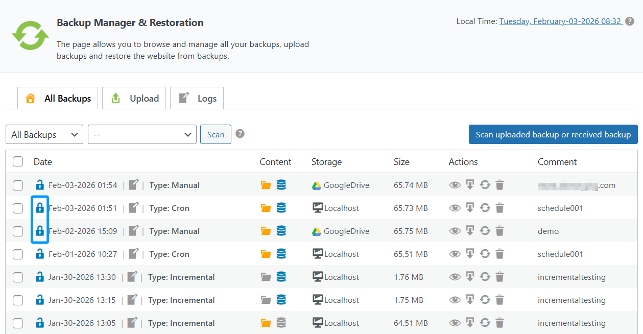 Go to the Backup Manager & Restoration tab, find your backup, and click the Lock icon. - 2. Effect: