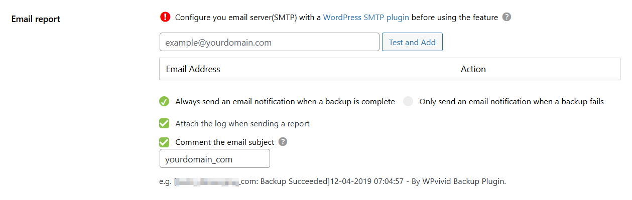 Add a custom comment or prefix to the email subject line. This is particularly useful for identifying which website the report is coming from (e.g., [Production Site] Backup Report). - 4. Attach Backup Log: