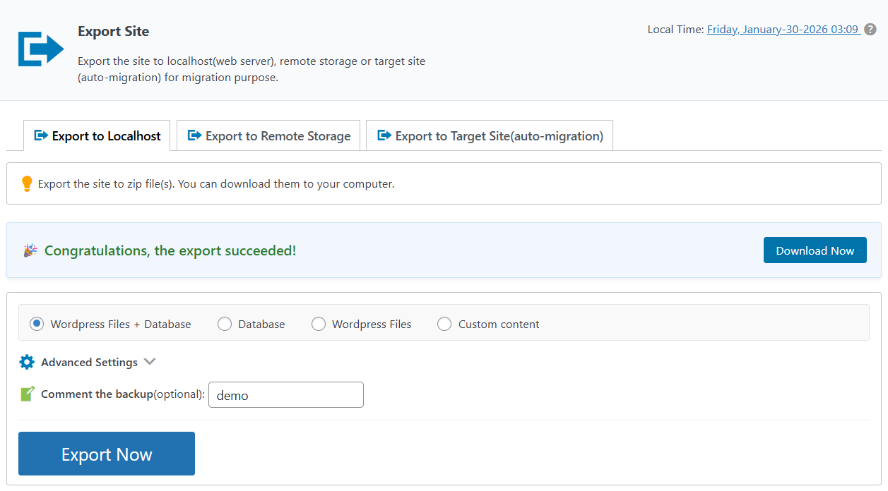 The Export Site feature in WPvivid Backup Pro provides a flexible and powerful way to package and transfer WordPress sites. By supporting exports to: