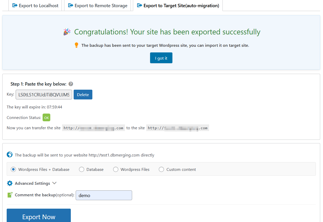 This option enables direct site transfer between two WordPress installations using WPvivid’s auto-migration mechanism.