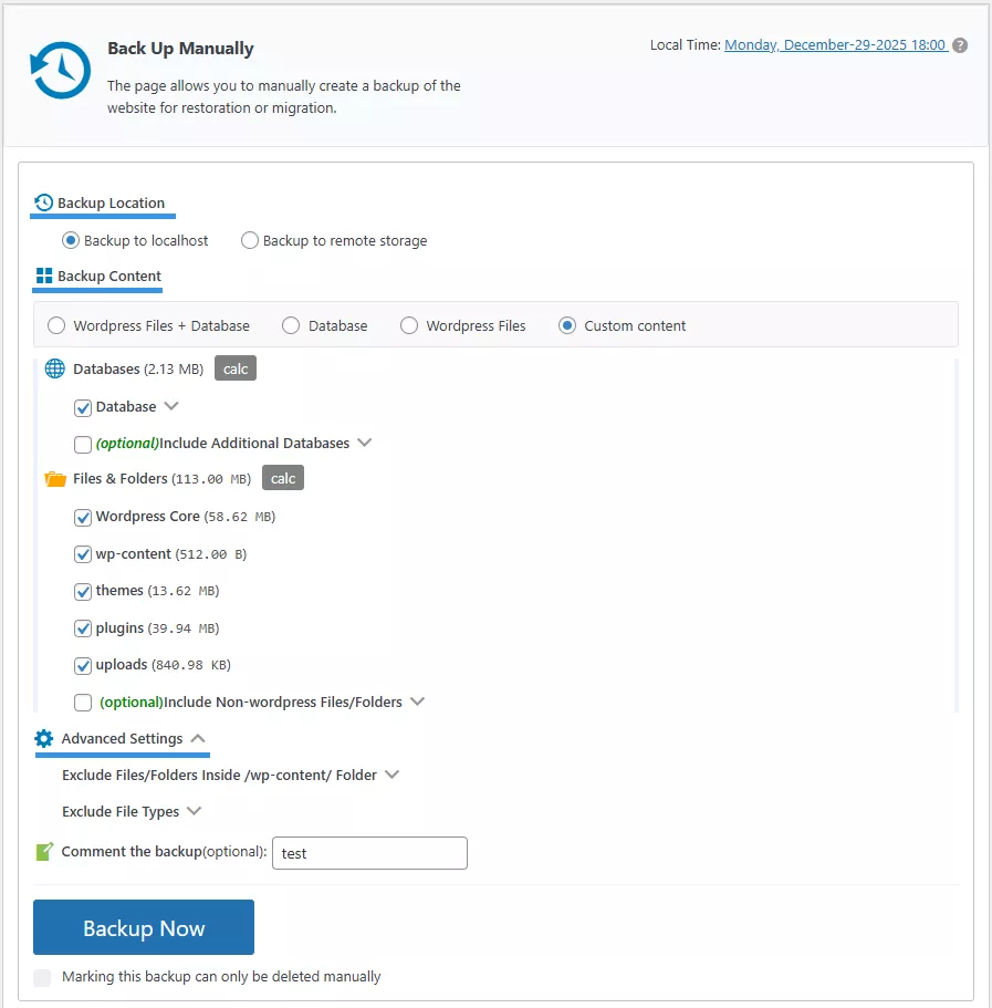 The Manual Backup page is the primary hub of the WPvivid plugin. From here, you can manually create on-demand backups for safekeeping, restoration, or website migration.