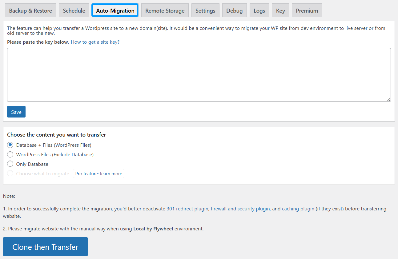 Transfers the entire site, including the database and all WordPress files. - 2. WordPress Files (Exclude Database)