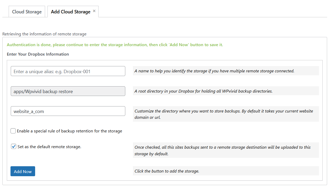 (Optional) Check this box if you want this Dropbox account to be the primary destination for all future manual and scheduled backups. - 5. Click Add Now to save settings.