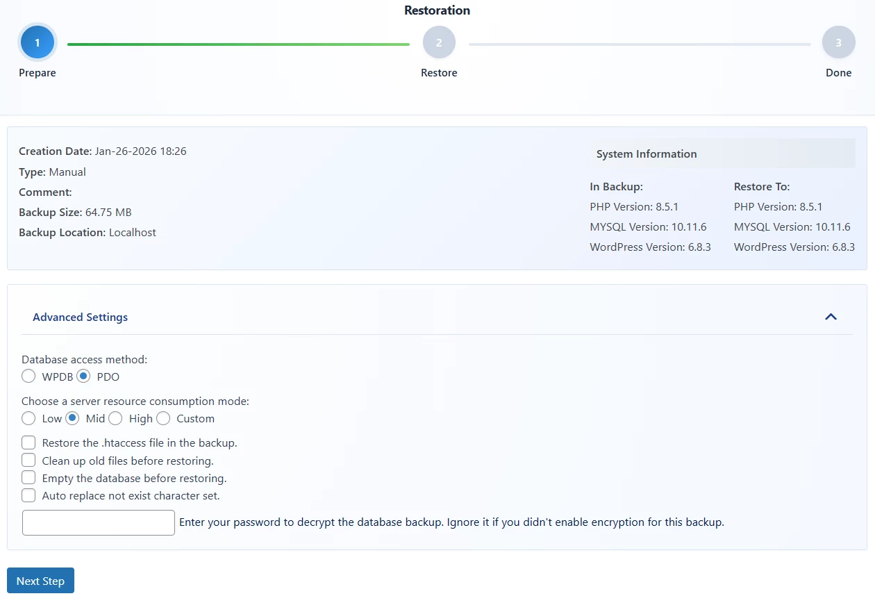 If you are on a limited hosting environment, set this to Low or Mid to prevent the process from being killed by the server.Restoration Completion