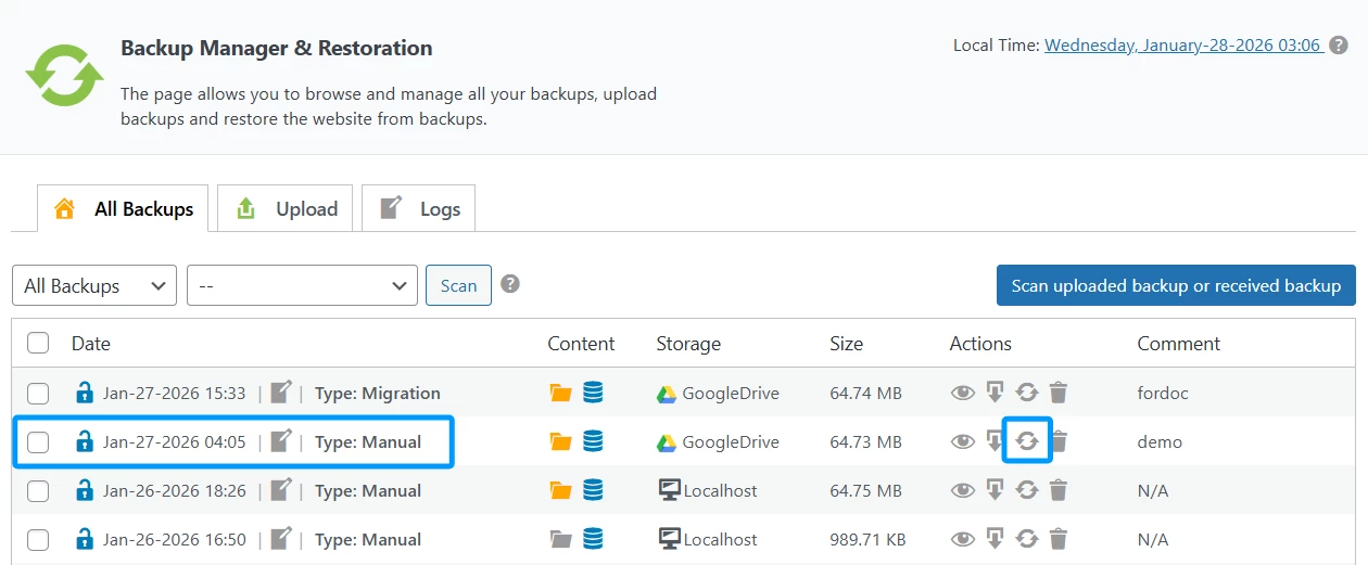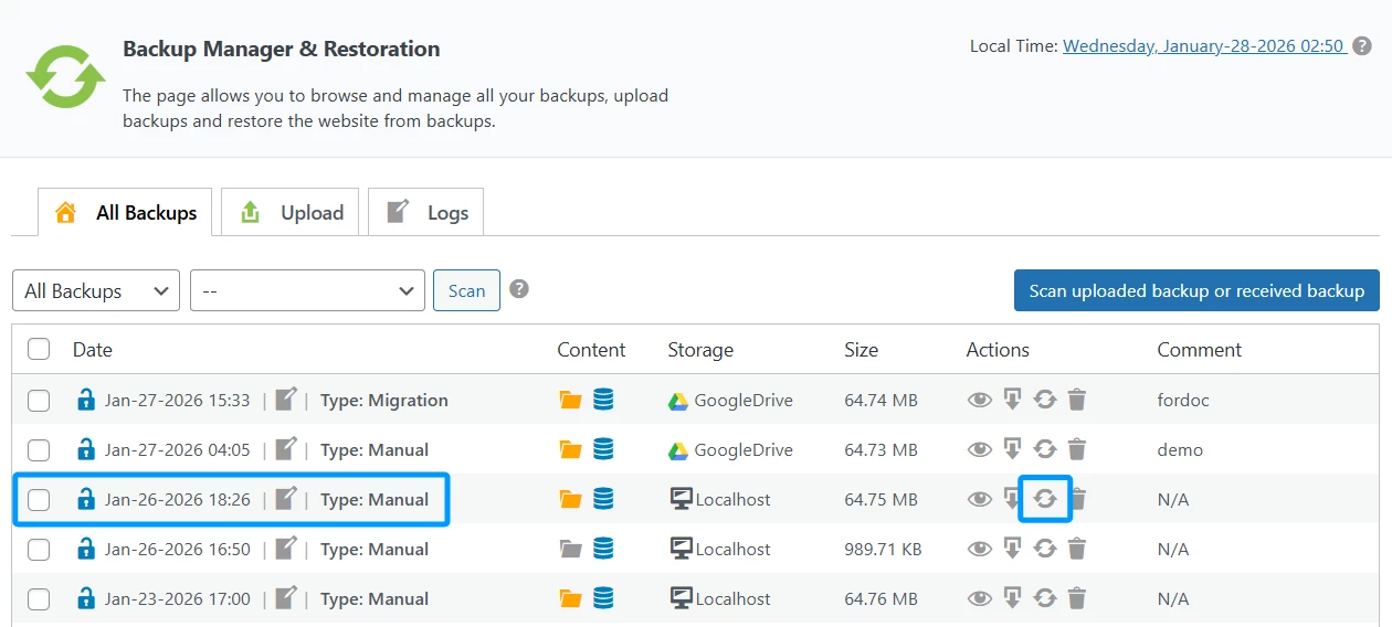 Look for backups where the Storage column is labeled as Localhost. - 3. Initiate Restoration: