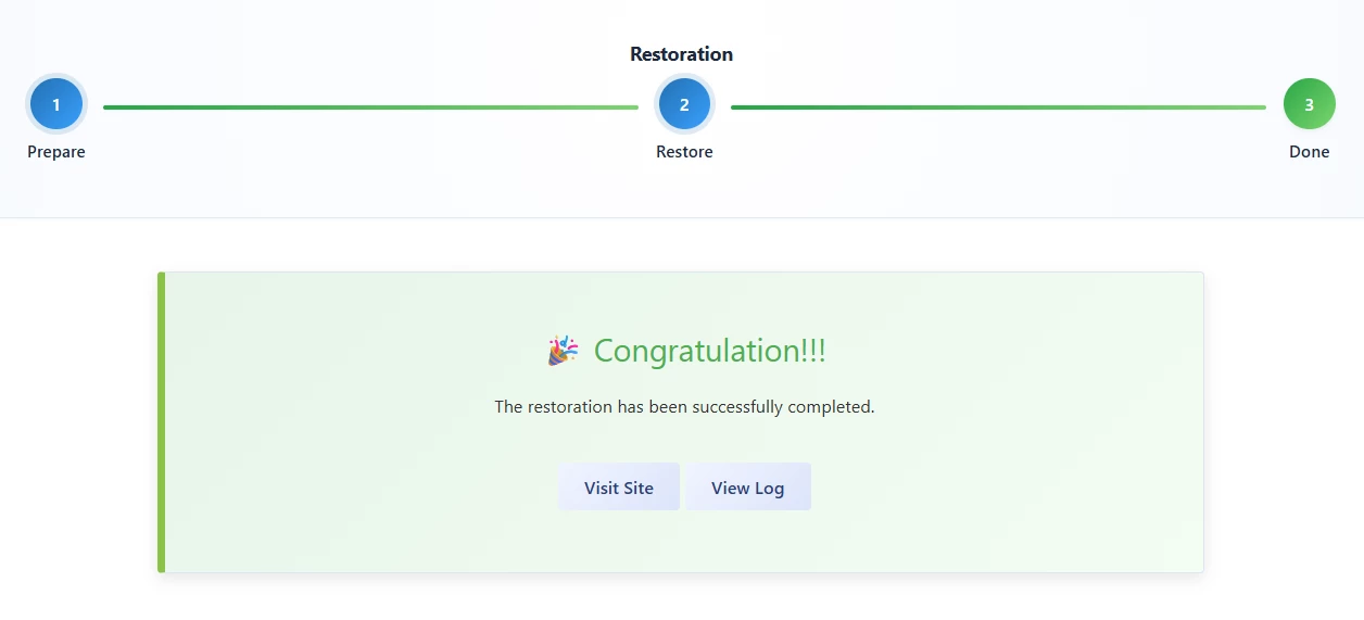 You will see a “Congratulations!!!” message confirming that the restoration has been successfully completed.