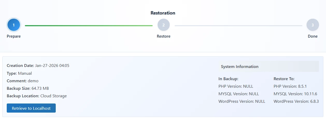 Because the plugin must process files locally, you will see a prompt to Retrieve to Localhost. Click this button to download the backup from the cloud to your web server. - 4. Proceed to Restore: