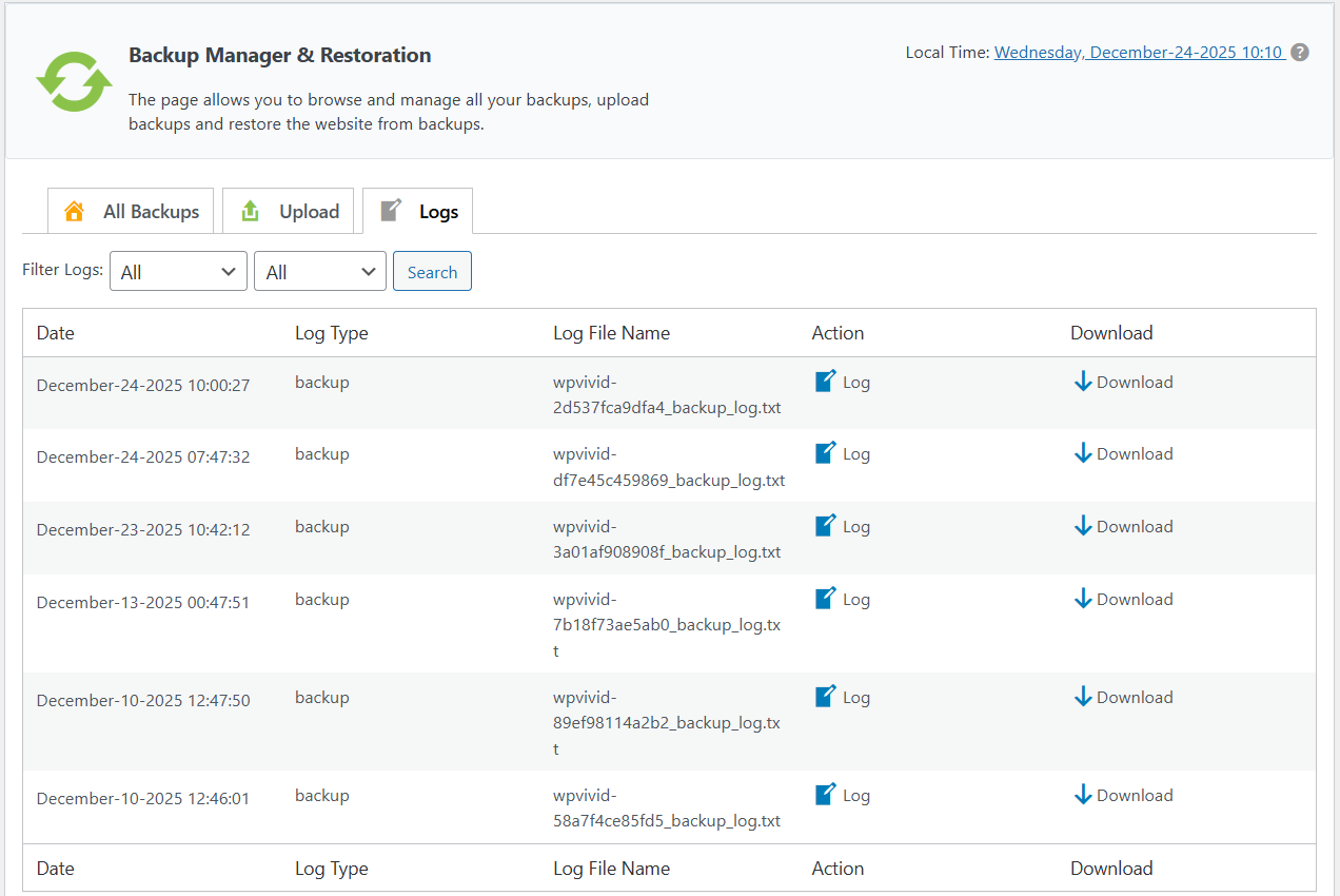 The Backup Manager & Restoration page serves as your central backup manager. From here, you can browse, download, and delete both local and remote backups, view activity logs, upload existing backup files, and perform site restorations (including restoring directly from remote storage).