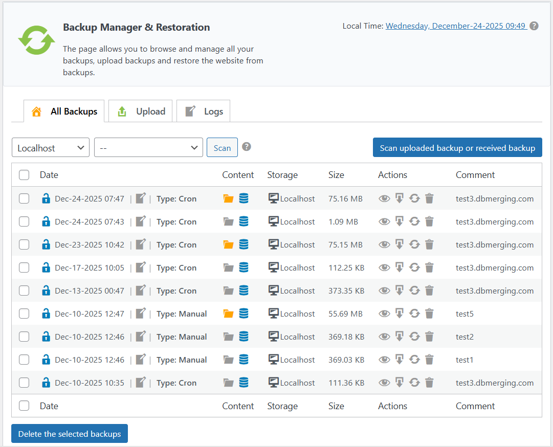- Filtering: You can use the dropdown menus to filter by backup location (Localhost or Cloud Storage) and backup type (Manual, Scheduled, Uploaded, Incremental, or Rollback).