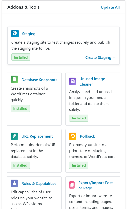 The Addons & Tools module lists all premium addons and tools included with your WPvivid Backup Pro license. You have the options to install or update addon/tools.