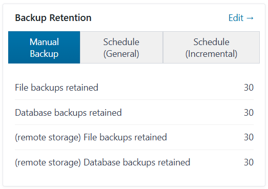 The Backup Retention module shows your current backup retention settings and provide a quick link for you to edit the retention settings.