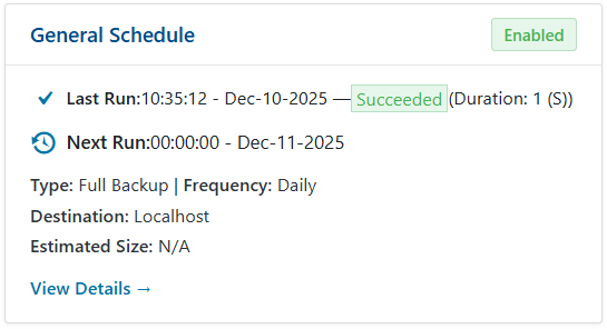 Last Run: Shows the timestamp and result of the last schedule backup.