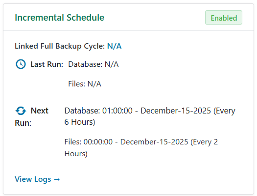 Last Run: Shows the status of the most recent incremental backup run for both the database and files.