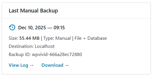 The Last Manual Backup module provides an immediate summary of the most recently created manual backup archive. This allows for quick verification and access to the file.