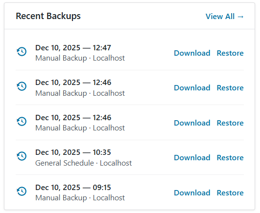 The Recent Backups module provides a list of the most recently completed backup tasks. It offers immediate actions for downloading and restoring from these files.