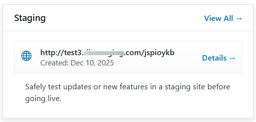 Actions: Includes a View All link to the staging site list and a Details link for managing the specific environment.