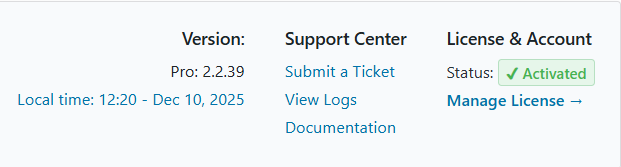 Support Center: Provides direct links to submit a ticket, view logs, and access the documentation.